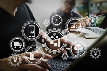 Smart factory and industry 4.0 and connected production robots exchanging data with internet of things (IoT) with cloud computing technology.Coworking process, entrepreneur team working in creative office space.