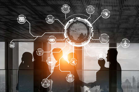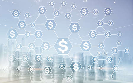 Economy and growth on global business network, Business strategy and Digital marketing. Data analysis of financial and banking, Teamwork and partnership, Customer, Technology and data connection.