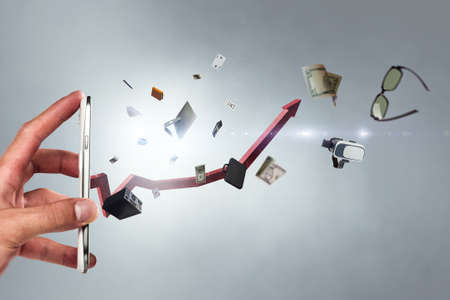 Double exposure of abstract creative financial chart and hand with cell phone on background, research and strategy concept