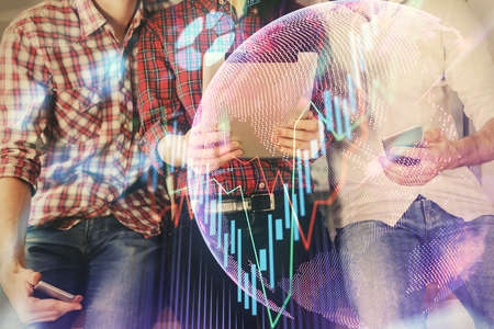 Double exposure of forex graph drawing and man and woman working together holding and using a mobile device. Trade concept.