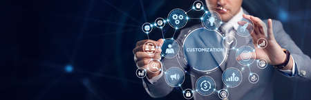 Business, Technology, Internet and network concept. Young businessman working on a virtual screen of the future and sees the inscription: Customization