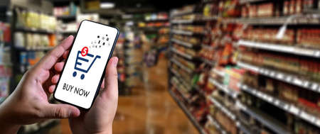 Smart phone online shopping in woman hand. Shopping center mobile shopping