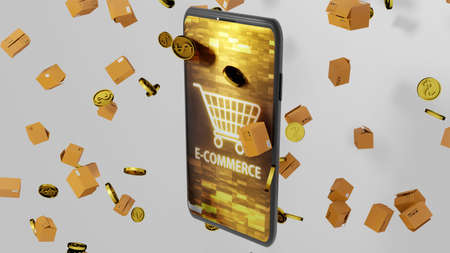 8K E-commerce 3D render Smartphone, Parcels, and Golden Coins Falling down with Shopping cart on Abstract Digital Display on the Screen Ver.2