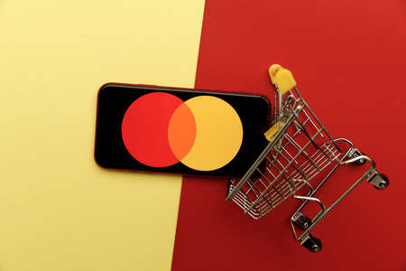 Tula, Russia - January 28, 2020: Mastercard logo on iPhone display