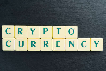 Cryptocurrency text made out of letter tiles. Large copy space in the top.