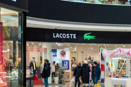 Tyumen, Russia-March 10, 2022: Lacoste French clothing clothes boutique store. Sale in the shopping center