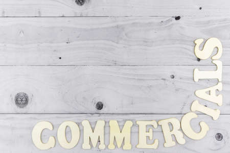 Commercials concept with alphabet letters forming a curved corner border on light grey wooden boards with copyspace for a design template
