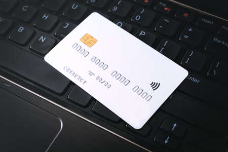 Close up of white credit/debit or online bank card mockup, on top of laptop keyboard.