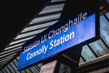 Dublin, Ireland - February 15, 2019: Blue platform sign announcing the name of the station in the Connolly DART train station (Staisiun ui Chonghaile) on a winter day