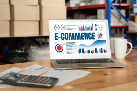 E-Commerce Text in small boxes and shopping cart. Concepts about online shopping. Isolated on white background