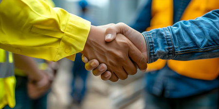 Architects and construction workers shaking hands in agreement on a construction site. Concept Construction Industry, Collaboration, Teamwork, Project Agreement, Building Construction