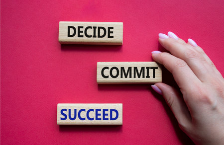 Decide Commit Succeed symbol. Concept words Decide Commit Succeed on wooden blocks. Businessman hand. Beautiful red background. Business concept. Copy space.