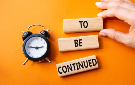 To be continued symbol. Concept words To be continued on wooden blocks. Businessman hand. Beautiful orange background with alarm clock. Business concept and To be continued. Copy space.