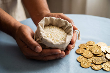 Open hands cup a linen sack filled with white rice grains placed next to scattered gold coins on a surface to represent abundance and prosperity in agricultural harvest themes
