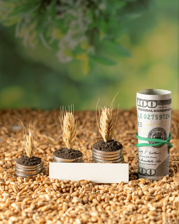 Ears of wheat on a clear surface, and coins beside it. Cost of grain, price increase, grain prices.
