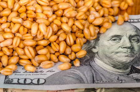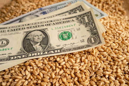 US dollar banknotes on grains wheat, Global Food Crisis concept.
