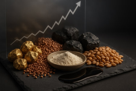 Assorted Natural Resources With Rising Market Chart, Gold Copper Coal Wheat Flour And Oil Concept