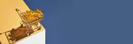 Omega3 gel capsules at shop cart. Sun shadow. Yellow vitamin. Health eating. Dietology drug. Fish oil supplement. Nutritional concept. Golden color softgel collagen. Blue background. Medicine immunity