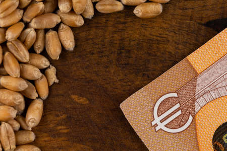 Wheat grains with details of 50 EUR banknote. Object lit with a uniform, soft light.