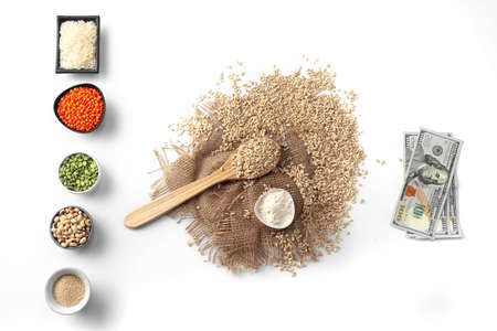 The concept of the cost of grain. 5000 ruble banknotes around a handful of ground grain. World hunger.