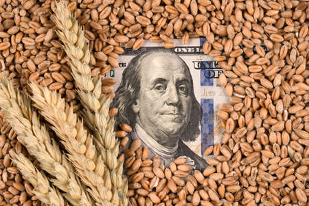 Hundred dollars banknote with ears of wheat and wheat grain. Global food crisis concept. Increasing prices for food and bread worldwide