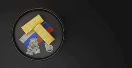 Russian oil barrel, 999 gold ingots and 100 dollrs. Angle from top. sanctions on Russian oil. 3D work and 3D illustration