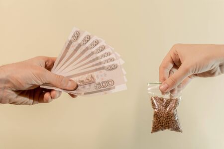 A person buys a buckwheat. The high price of buckwheat and the growing demand during quarantine. Concept.