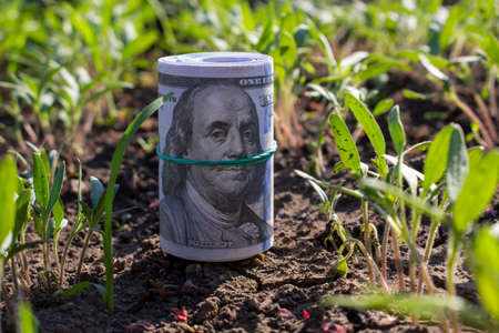 Twisted hundred dollar bills on fertile soil near the seedlings of tomatoes. Business concept.