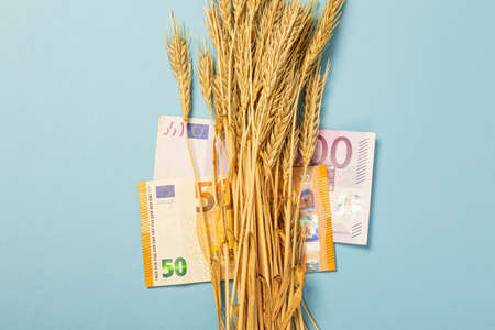 Paper money currency of wheat and euro banknotes on a blue background. The theme of the shortage of grain wheat groats. macro close-up