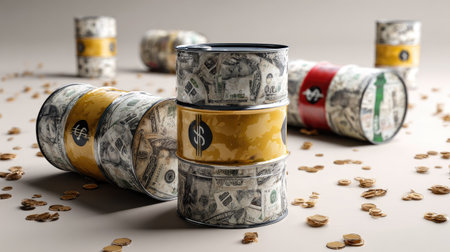 Barrels with selective focus on blurry dollar and euro bills background