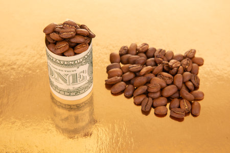 rolled one-dollar bill brimming with coffee beans on a shiny gold surface, with more beans scattered nearby, representing wealth and trade