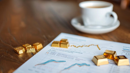 A financial newsletter with a gold price graph, lying on a desk beside a cup of coffee.