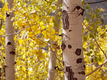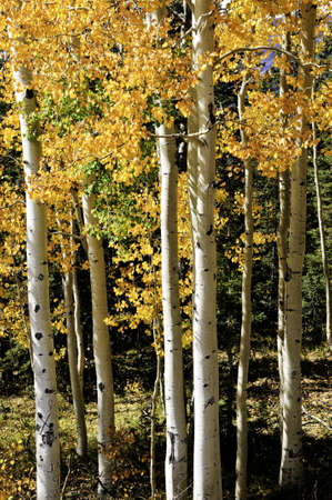 Autumn turns aspen trees a golden yellow that contrasts their white trunks.