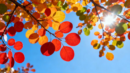 Vibrant yellow and green leaves adorn the branches of aspen trees, creating a colorful canopy against the blue sky during the fall season