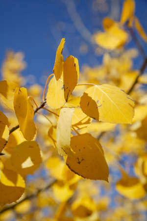 Golden aspen leaves contrasted against clear blue sky background in Colorado