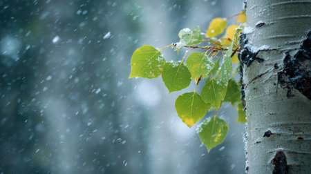 First snow falling gently on Poplar bark, a few snowflakes drifting slowly and settling on the leaves; fresh air.