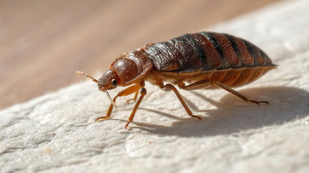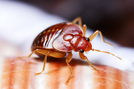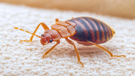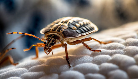 High-definition macro view of a bedbug crawling on the surface of a bed, highlighting its tiny legs and brown shell