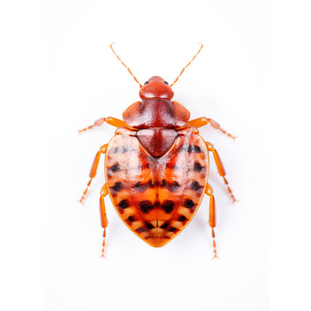 Overhead shot of a spotted orange bedbug on a stark white background, highlighting its unique spotted wing covers