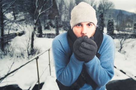 Charming traveler warms his hands in the cold. Snowy forest and rocks. Climbing the mountain in winter. Survival in the wild. high quality photo