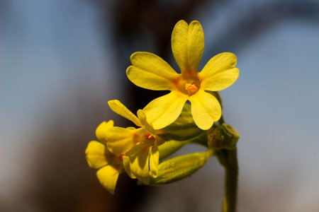 Beautiful spring yellow primrose (ox lip) flower growing in forest. Taken at sunset, low sun light.