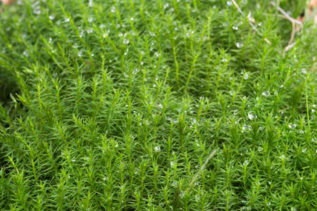 Star Moss: A close-up shot of beautiful green plants in the open air. Star moss with raindrops