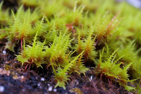 Close-up of the green moss, the spiky leaves on its surface show that it is covered with small rhizomes and tiny buds. The background features an out-of-focus forest floor. --ar 3:2 --v 6.1 Job ID: 51b11c05-0684-4222-84f5-5c7a3d485e92