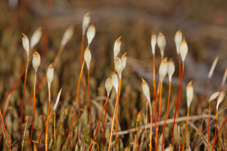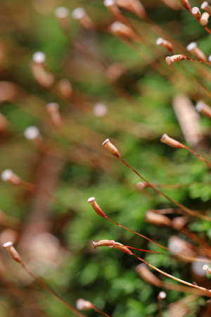 Haircap moss or hair moss Sporophyte. Plant Polytrichum commune, common haircap, great golden maidenhair or great goldilocks. Floral background macro close-up