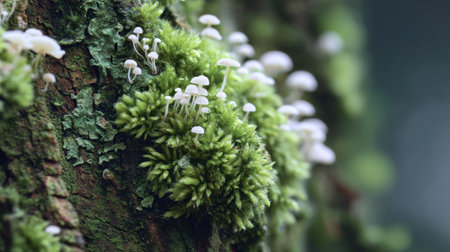 Explore the beauty of nature with this close-up view of vibrant green moss and delicate white mushrooms adorning a tree bark, showcasing forest tranquility.