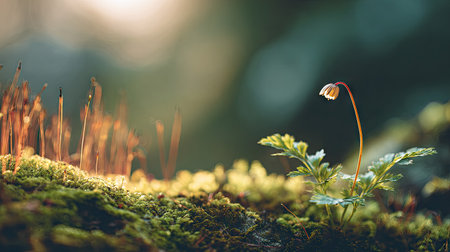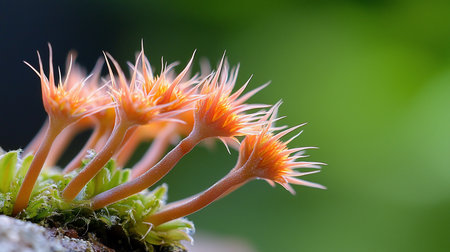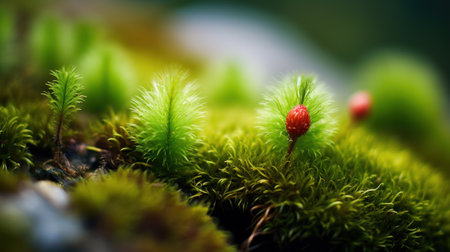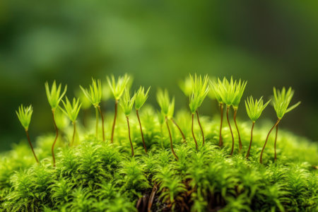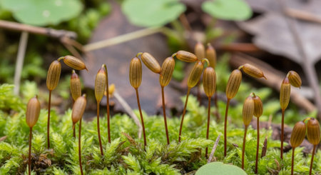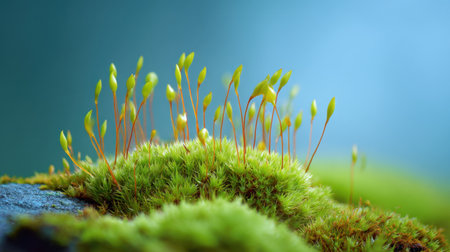 Close-up view of vibrant green moss adorned with delicate spore capsules, showcasing the beauty of nature in a serene outdoor setting with soft focus.