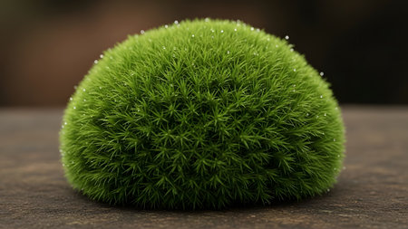 A vibrant green grass ball is centered on a dark, textured surface, with dew drops glistening on its surface, creating a serene and natural ambiance.
