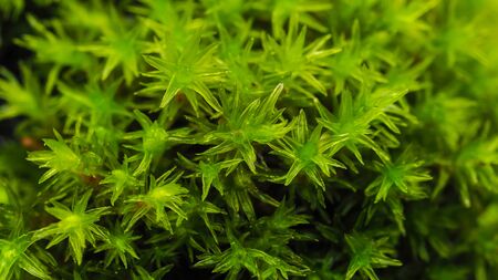 macro closeup of common hair cap moss, star shaped leaves, cosmopolitan wild plant specie