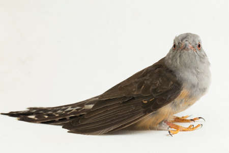 Beautiful bird, female of Plaintive Cuckoo (Cacomantis merulinus) perching on a branch on white background.