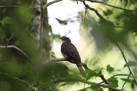 A brown bird is perched on a tree branch, surrounded by green foliage. The bird appears to be resting or observing its surroundings.