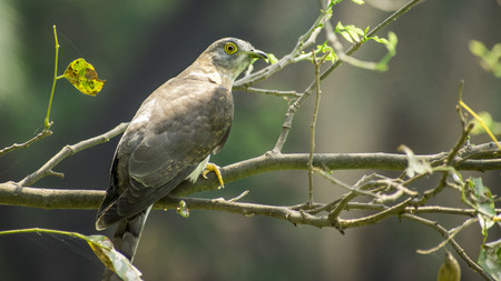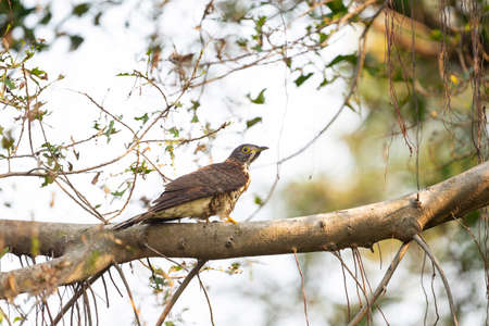Large hawk-cuckoo (Hierococcyx sparverioides) the eagle hawk with yellow eye rings perching on the tree showing side and back feathers profile